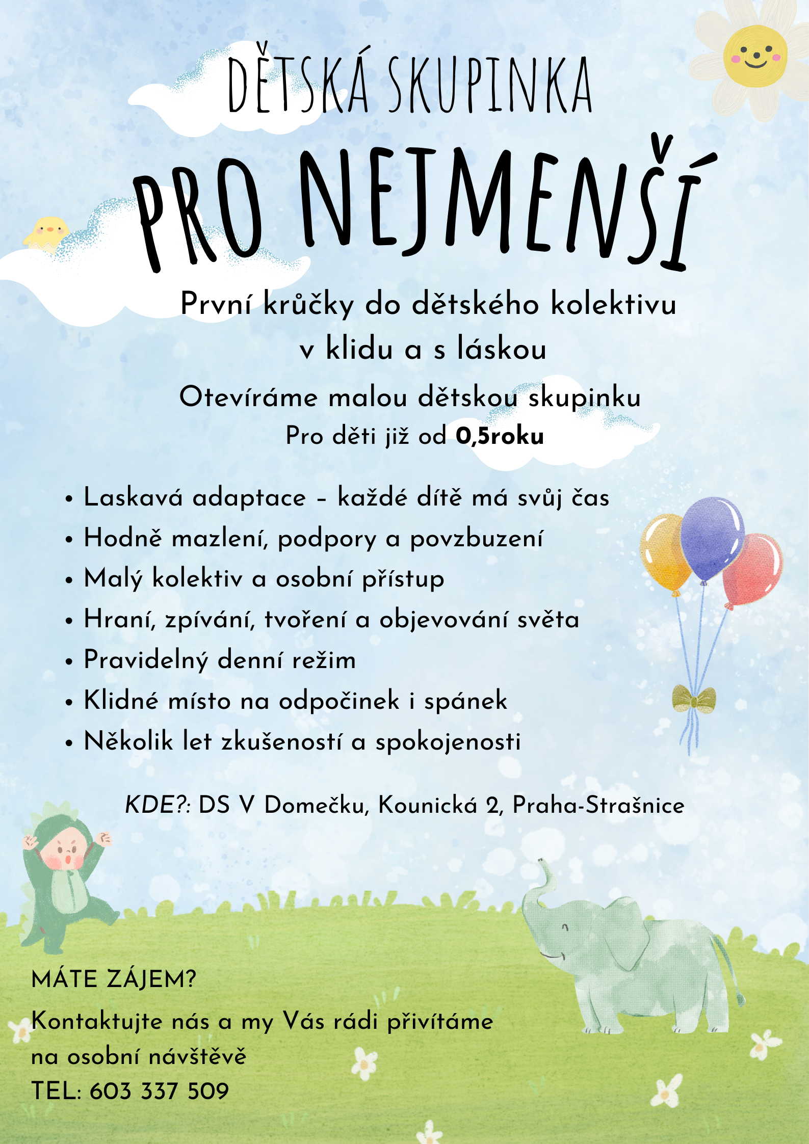 DS Opičky je na Praze 12 v ul. Obchodní náměstí. Děti mají krásnou hernu a velikou tělocvičnu. Do skupinky přijímáme 12 dětí, od září 2025 jsou volná poslední 2 místa.